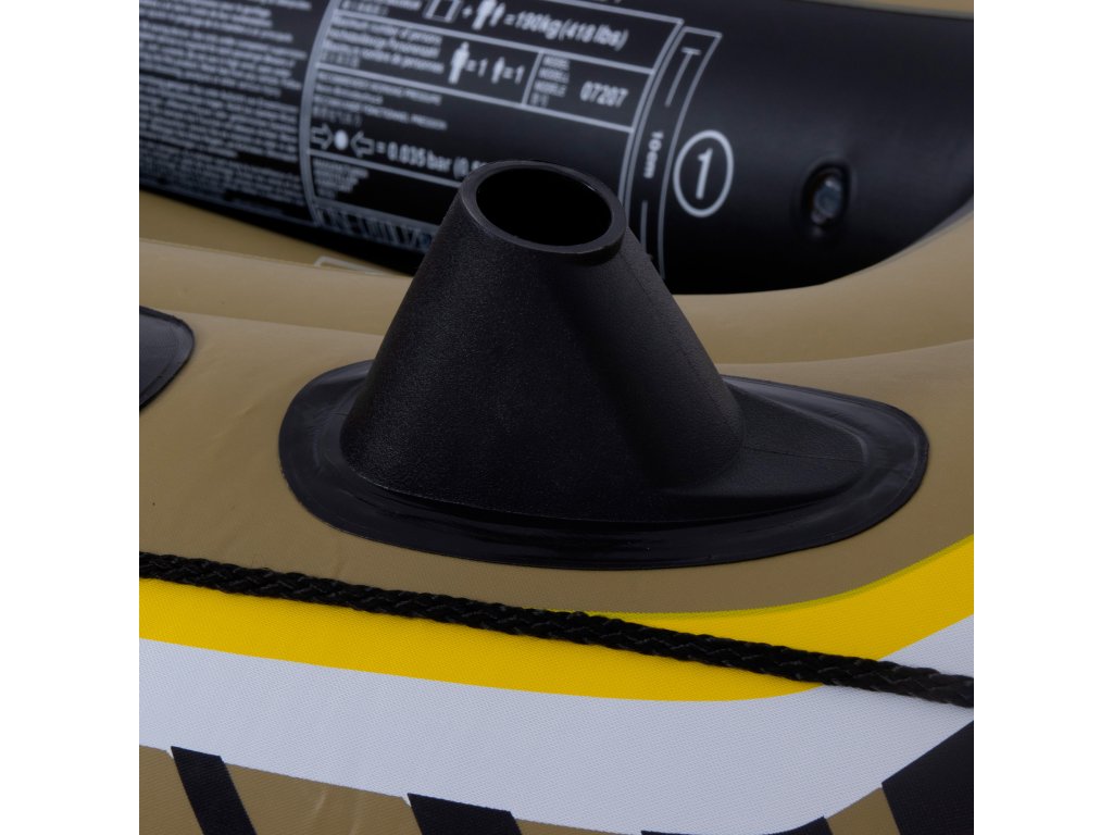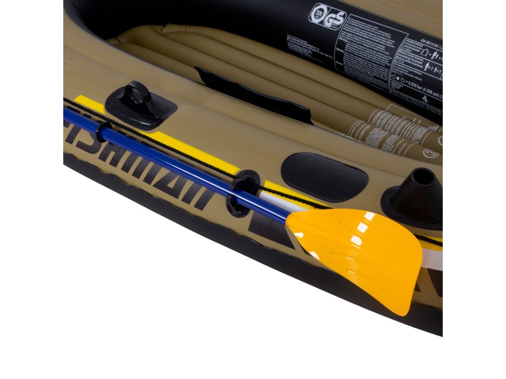 A masszív PVC anyagból készült csónak kopás- és mechanikai sérülésállóságot nyújt. Négy független légkamra és biztonsági szelepek növelik a stabilitást és minimalizálják a levegővesztés kockázatát. Ez nyugalmat garantál még intenzív használat közben is.