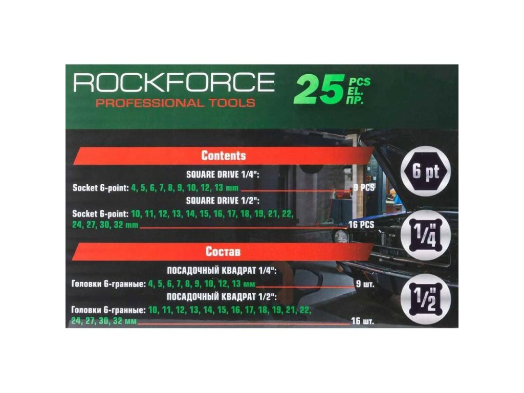 1/2" és 1/4" hatlapú dugókulcs készlet 4-32mm, 25 darabos táskában