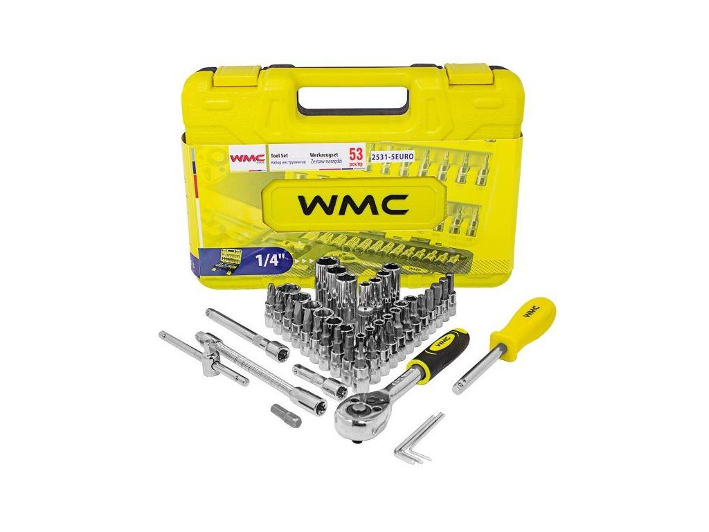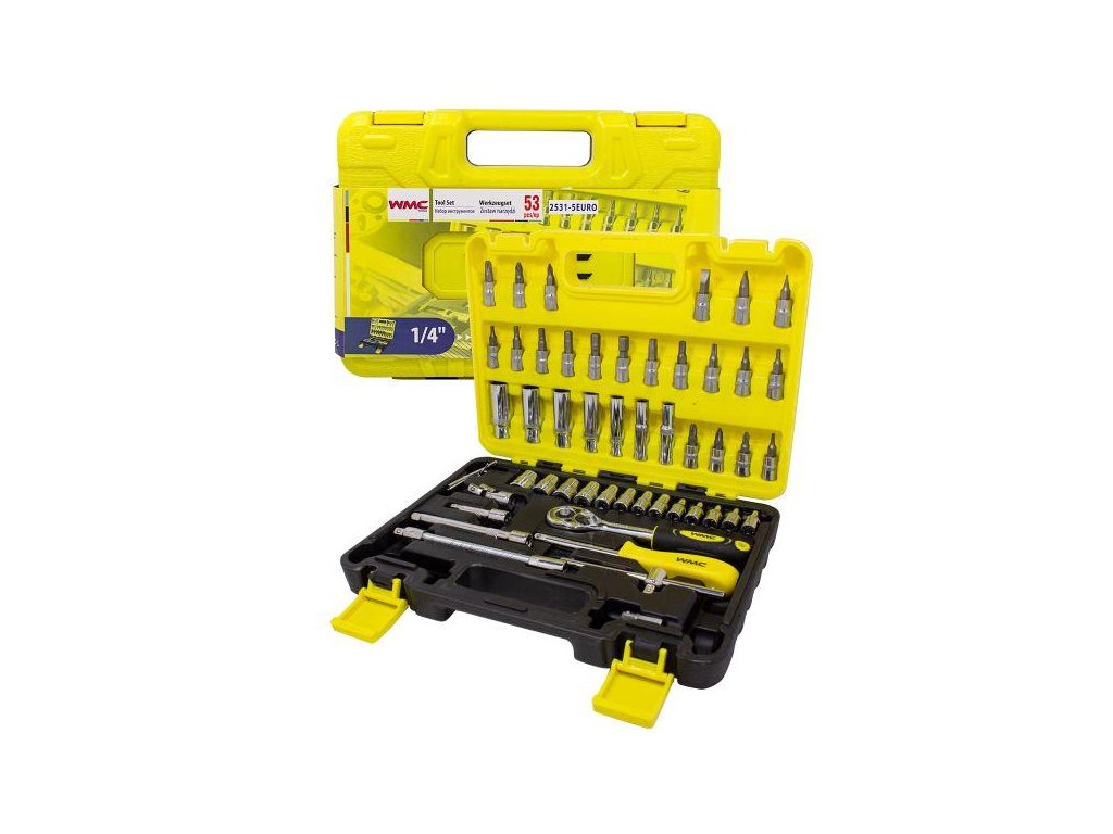 A 1/4"-os dugókészlet 53 elemből áll, magas minőségű króm-vanádium acélból készült.A készlet tartalmaz egy racsnis kulcsot, tartós mechanikus rögzítéssel. A készlet gazdag készlet dugókból áll (4-től 14 mm-ig) és gyújtógyertyához való dugókból, csavarhúzó fejekből (lapos, kereszt, hatszögű, Torx). Kiegészítőként hosszabbítók (köztük rugalmas), univerzális ízület, hatszögű kulcsok, T típusú fogantyú és bit tartó található. Az elemek praktikus táskában vannak rendezve. A készlet kiválóan alkalmas mind professzionális, mind hobbi használatra. A professzionális gyártás és a hőkezelt króm-vanádium acél biztosítja a tartósságot és a megbízhatóságot. Minden kulcs méret fel van tüntetve a felhasználó kényelme érdekében.