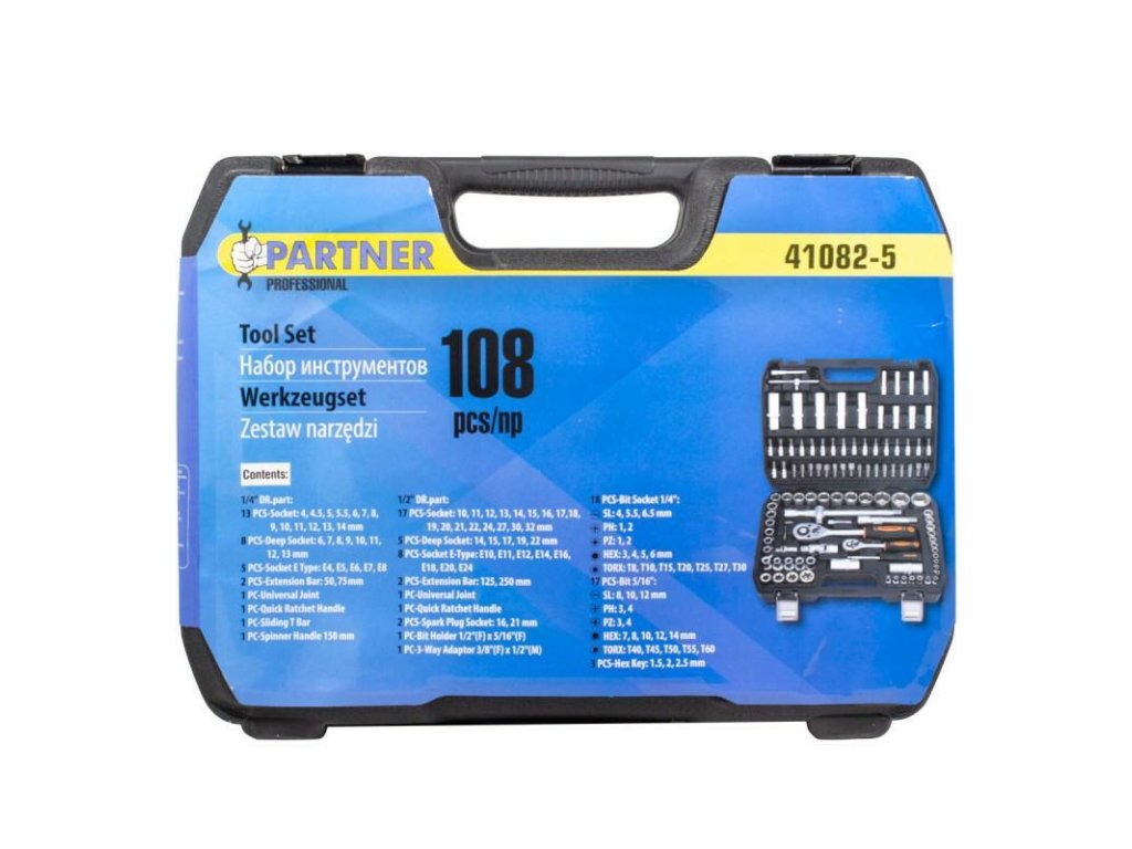 A 108 elemből álló dugókulcs készlet eredeti táskába van csomagolva. A táska magas minőségű műanyagból készült és tervezett. A készlet tartalmaz mindent, amire szüksége van a házi barkácsolónak és az autószerelés kedvelőjének.
