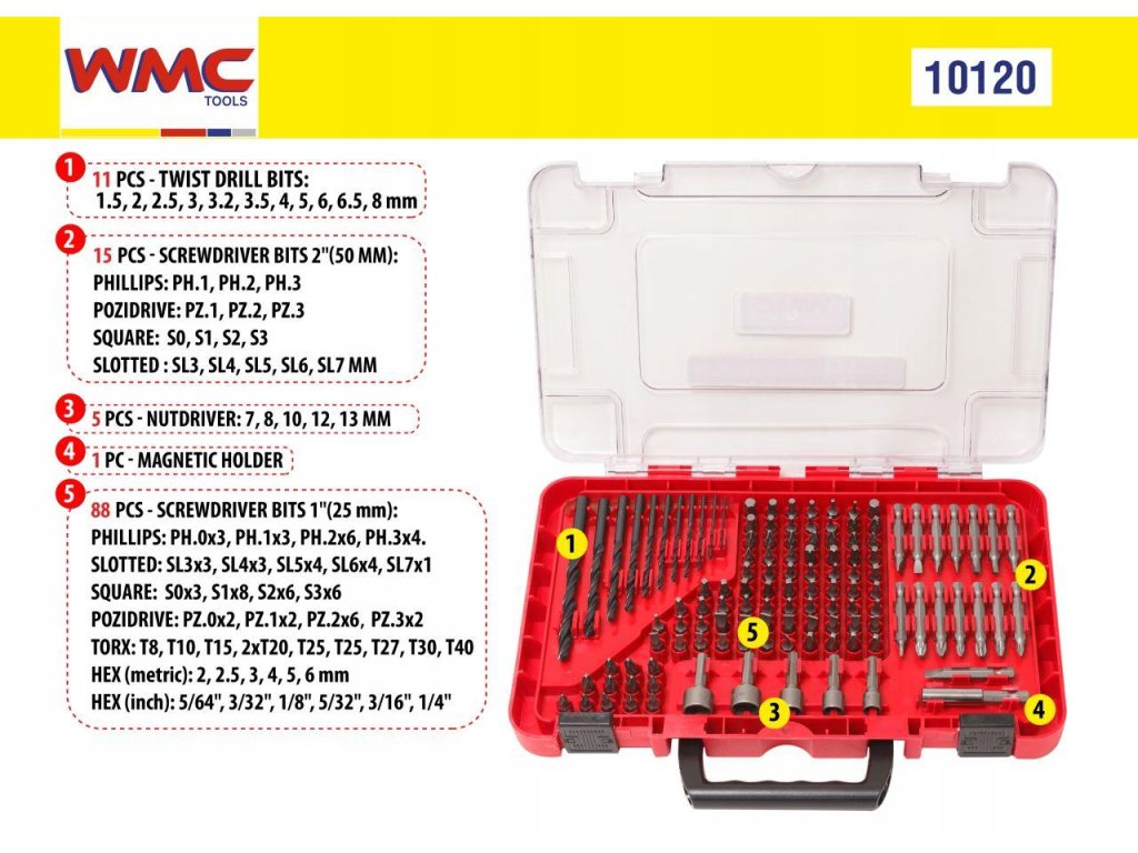 Az egész egy praktikus, kompakt méretű bőröndben van csomagolva. A készlet 120 db tartozékot tartalmaz, amely lehetővé teszi a leggyakrabban előforduló szerelési feladatok elvégzését.