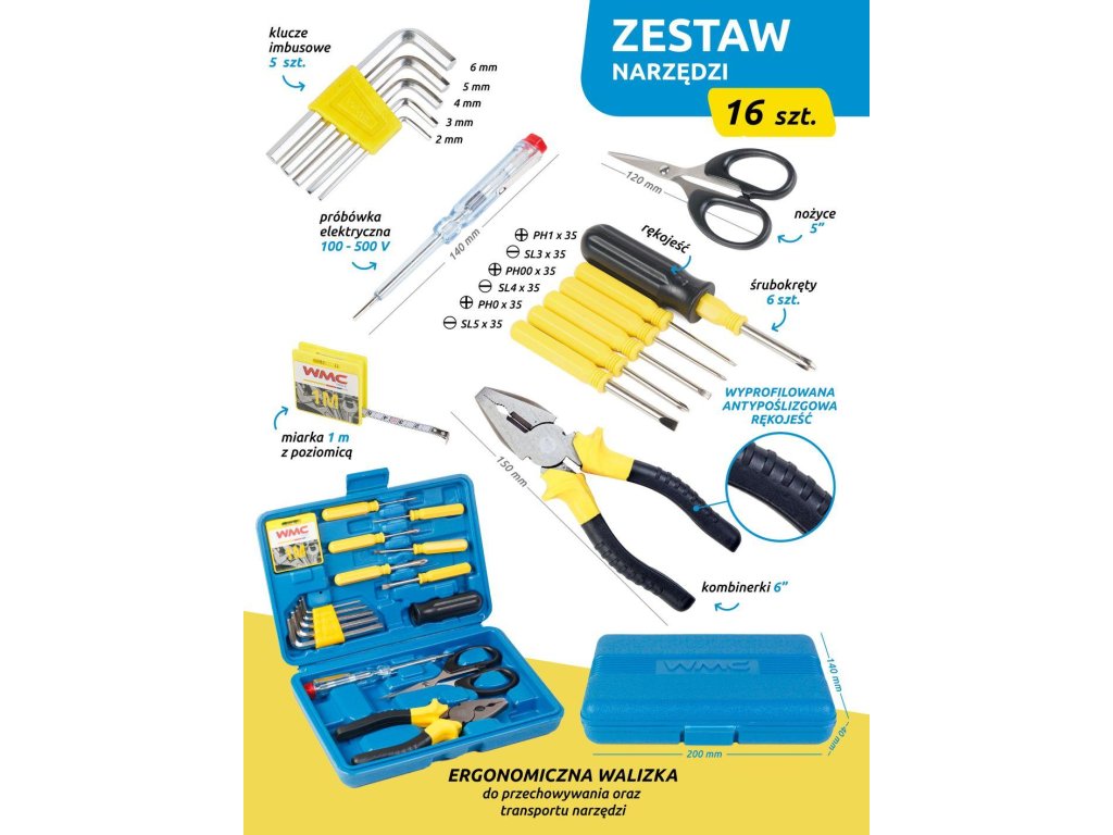 16 részes szerszámkészlet kombinált fogókkal, csavarhúzókkal és imbuszkulcsokkal