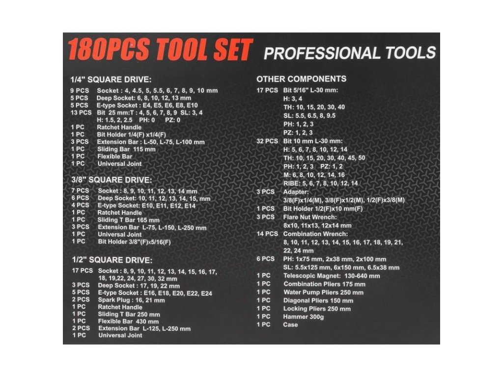 180 darabos szerszámkészlet 1/4" és 3/8" - 180 darabos szerszámkészlet 1/4" és 3/8" méretben