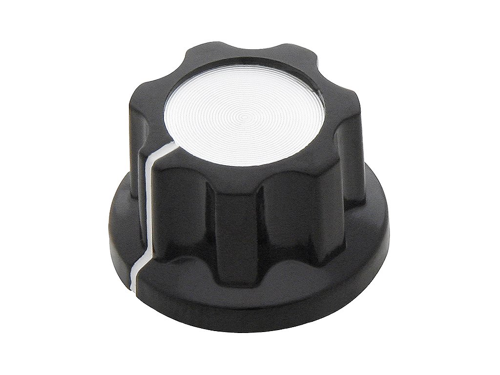 átmérő a talpnál: 23 mm gomb átmérő: 19 mm magasság: 14 mm tengely átmérő: 6 mm csavarral zárva anyag: bakelit gomb színe: fekete, ezüst sapka színe