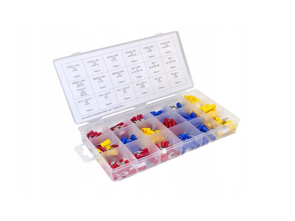 A konektorok rendszerezve és megjelölve vannak. A készlet számos méretet tartalmaz.