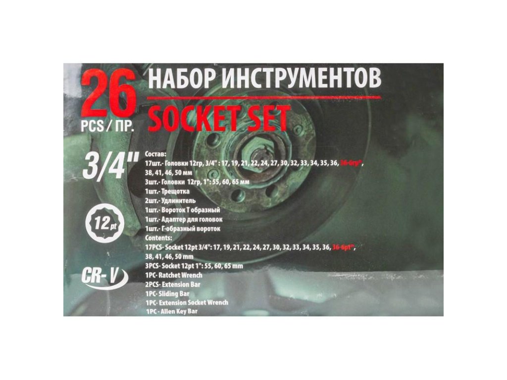A készlet 26 elemet tartalmaz. Az összes dugókulcsot és átalakítót praktikus műanyag táskában helyezték el, amely garantálja a biztonságos szállítást, a véletlenszerű kinyílás lehetősége nélkül.