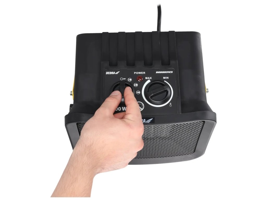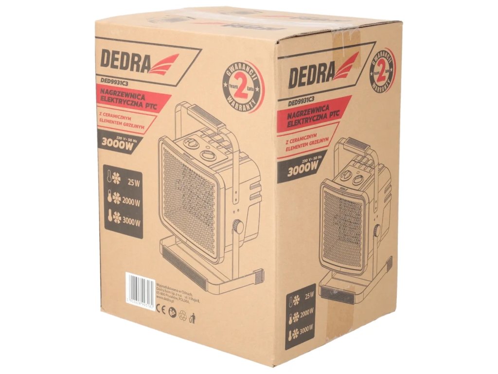 Az elektromos fűtő DED9931C 3 kifejezetten zárt terekben való használatra készült. Használható lakó- és kereskedelmi helyiségek fűtésére, mint például pincék, garázsok, műhelyek stb. Az eszköz kiegészítő hőforrásként szolgál, nem pedig fő hőforrásként. Ha a hőmérsékletgomb alacsony szintre van állítva, az eszköz nem használható fűtési funkció nélküli elektromos fűtőként. A kerámia fűtőelem (PTC) biztosítja, hogy a hő az eszköz bekapcsolása után szinte azonnal érezhető legyen. Kényelmes hordozófogantyú.Ez a termék csak alkalmi használatra vagy jól szigetelt helyiségekben történő használatra alkalmas.