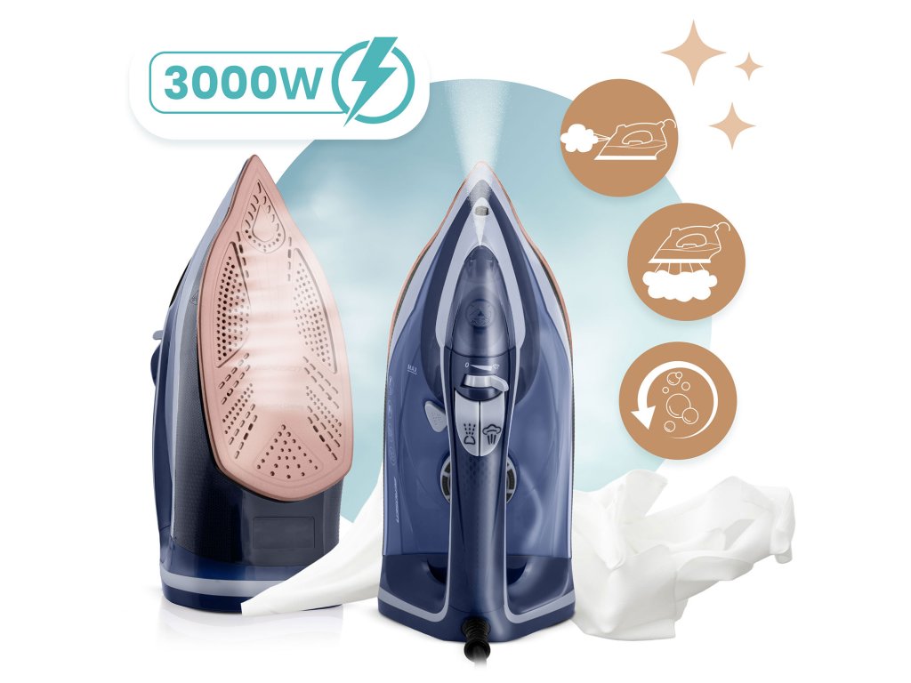 AKÁR 3000 W TELJESÍTMÉNY | ÖNTISZTÍTÓ | TÚLMELEGEDÉS ELLENI VÉDELEM | 350 ML VÍZTARTÁLY | FÜGGŐLEGES GŐZ | HŐMÉRSÉKLET-SZABÁLYOZÁS | AUTOMATIKUS KIKAPCSOLÁS | PERMETEZŐ
