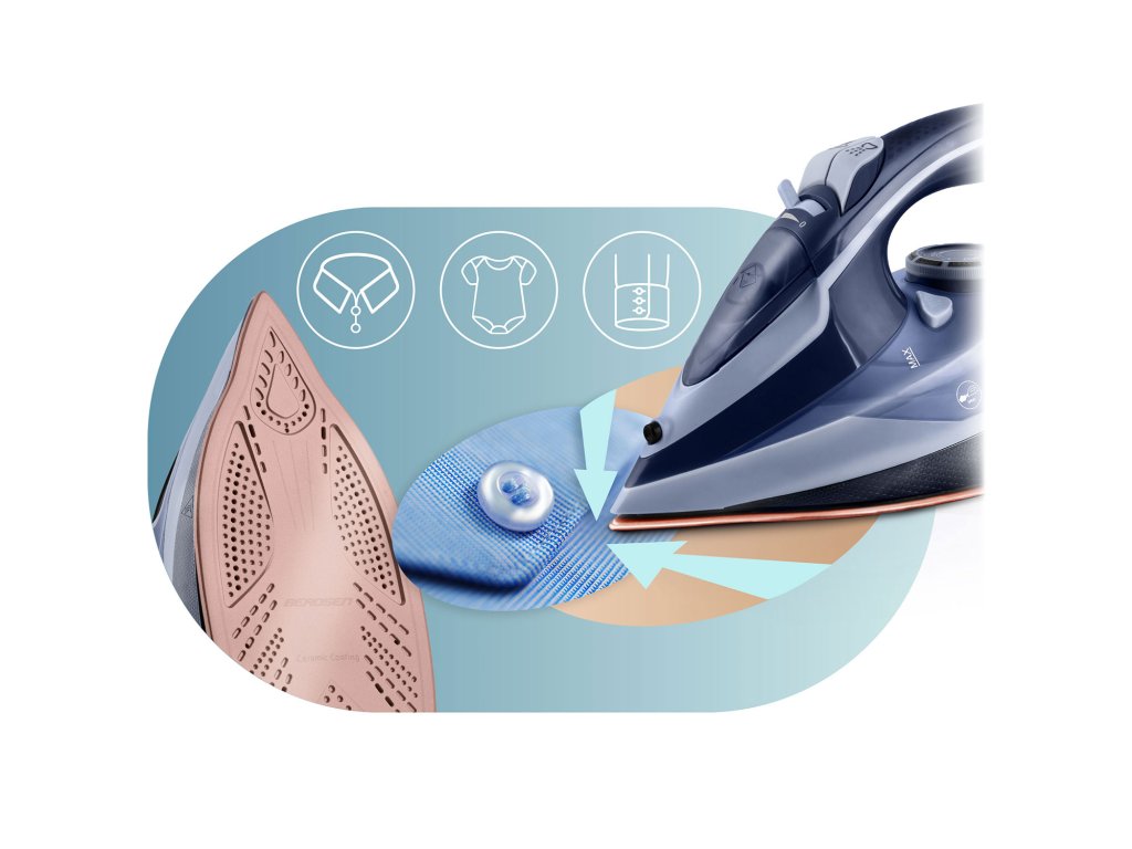 Odaér, ahová más vasalók nemEgyedülállóan precíz, formázott kerámia talp, ami valódi áttörés. Karcsú kivitele lehetővé teszi, hogy gond nélkül elérje a nehezen hozzáférhető helyeket – gombok között, gallérok körül, mandzsettáknál vagy gyermekruházatnál.