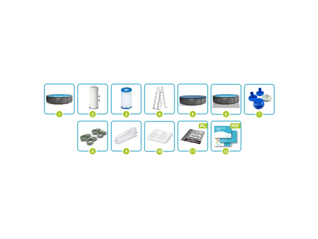 Basen ogrodowy stelażowy 457 x 122 cm ★★★★★ Zestaw 12w1 Nr katalogowy INTEX ® 26742 ★★★★★ PREMIUM DESIGN ★ Jeśli potrzebujesz dużego, niezawodnego basenu, w którym będziesz mógł swobodnie pływać - to idealny wybór dla Ciebie! ★ Gotowy zestaw z kompletnym wyposażeniem – nie musisz sam szukać wszystkich elementów. ★ Kupując basen INTEX z dedykowanymi akcesoriami masz pewność, że otrzymasz najwyższą jakość i wszystko będzie do siebie pasować. Zawartość zestawu Basen stelażowy 457 x 122 cm Pompa filtrująca Filtr do pompy Metalowa drabinka Pokrywa basenowa Mata pod basen Sitka do pompy Zaciski do pompy Węże do pompy Instrukcja obsługi Łatka naprawcza Przewodnik do pobrania w aukcji Bezpieczeństwo dziecka Odłączane stopnie uniemożliwiają wejście dzieciom bez opieki Wysokość idealnie dobrana do wielkości basenu Wzmocniony metalowy stelaż odporny na korozje Antypoślizgowe stopnie Wygodne poręcze Najwyższa jakość wykonania Wytrzymały 3 warstwowy materiał PVC Wzmocnienie z nylonowej siatki pomiędzy warstwami Powłoka odporna na przebicia Wnętrze imitujące mozaikę w kolorze biało-niebieskim Pokrywa Zabezpiecza wodę w basenie przed zabrudzeniami Uniemożliwia dzieciom wejście do basenu bez Twojej zgody Spowalnia utratę ciepła z wody Mata Zabezpiecza dno przed uszkodzeniem Chroni przed wnoszeniem do basenu piasku i innych zabrudzeń Izoluje basen od podłoża Dane techniczne Basen Wymiary basenu: 457 x 122 cm Waga basenu: 73,4 kg Zalecane wypełnienie wodą 90 % Pojemność: 16805 litrów Pompa Wydajność: 3785 l/godz Zasilanie: 220 - 240 V Typ filtra: typ A Numer pompy: 28638 ❤️❤️❤️ Spraw by to lato było pełne cudownych wrażeń! ❤️❤️❤️Kiegészítő paraméterek