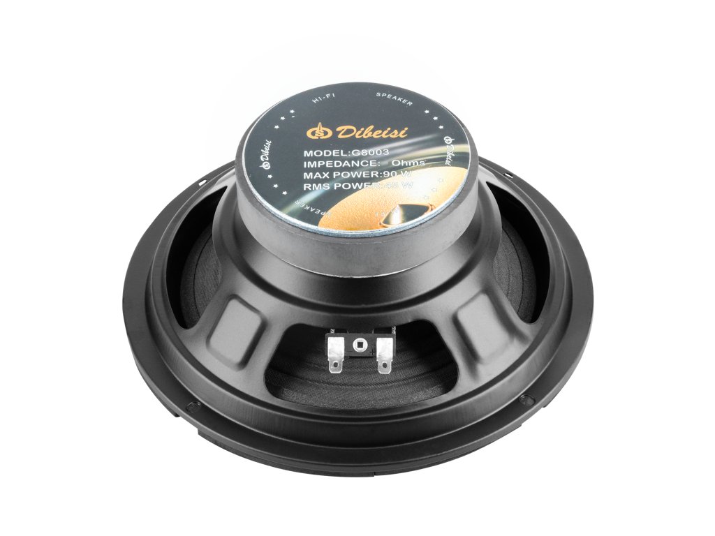 Impedancia: 4 Ohm Átmérő: 8" (20 cm) Maximális teljesítmény: 90 W RMS teljesítmény: 45 W Hatékonyság: 90 dB (1 W/1 m) Frekvenciatartomány: 45 Hz - 6 kHz Mágnes: 20 Oz Felfüggesztés: Habszivacs Membrán: Papír tekercs: 2,5 cm Méretek: 193 x 182 x 100 x 78 mm