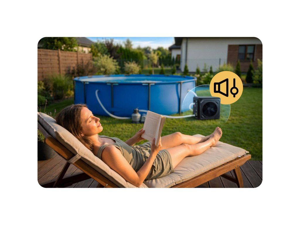Teljesítményfelvételekörülbelül 900 W, ami azt jelenti, hogy sok, a mindennapokban otthon használt készülékhez hasonlítható. A gyakorlatban jóval kevesebb energiát fogyaszt, mint például egy elektromos vízforraló, így a medencevíz fűtése nem eredményez magas villanyszámlát. Ez egy olyan megoldás, amely a fűtési teljesítményt gazdaságos készülékműködéssel ötvözi. Csendes működés – mindössze 48 dB