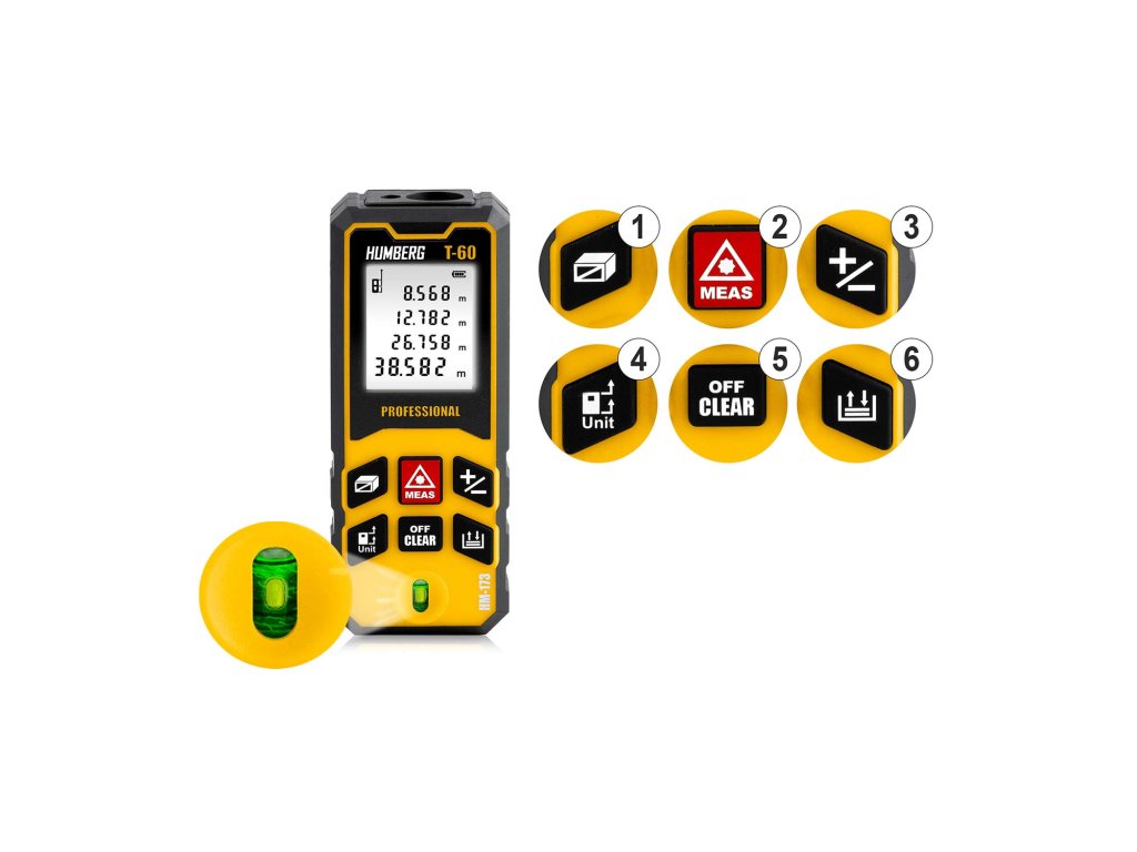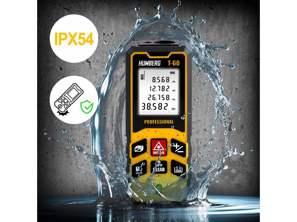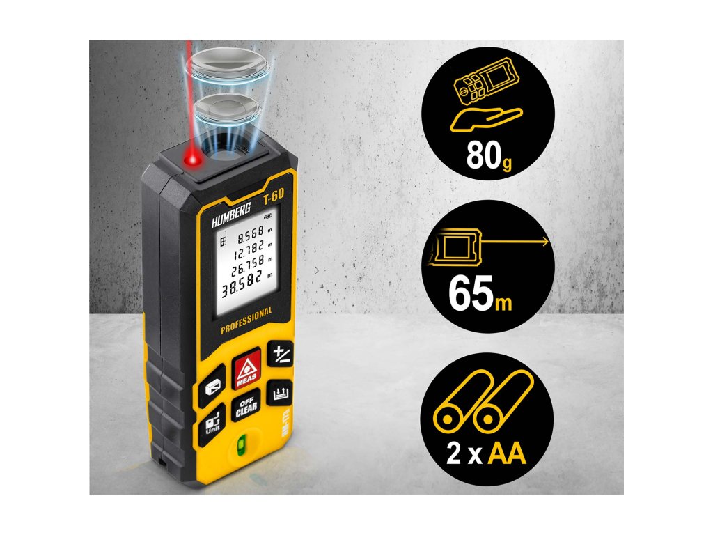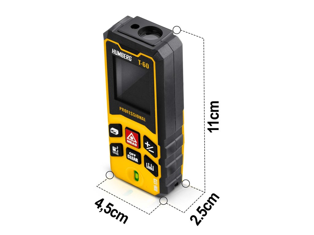 A HUMBERG T-60 lézeres távolságmérő akár 65 méteres mérést is lehetővé tesz, ami megfelel egy teljes futballpálya szélességének! Így lehetőséged nyílik pontos mérések elvégzésére nagy távolságokon, mind a munkában, mind a terepen.