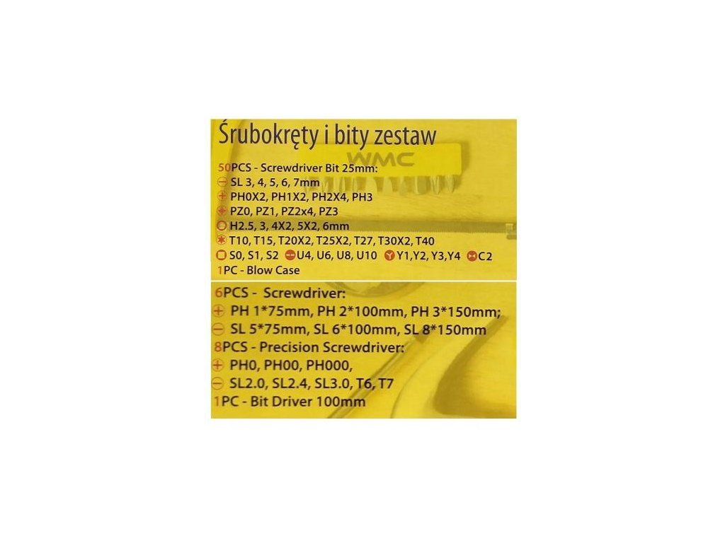 A WMC csavarhúzó és bitkészlet 65 kiváló minőségű elemet tartalmaz. A munkavégző végződés kemikálisan kezelve lett, ezáltal megfelelő keménységet és hajlítással szembeni ellenállást nyert. A csavarhúzó mágneses végződéssel rendelkezik. A markolat megakadályozza a csúszást a tenyérben, ellenáll a vegyszerek, olajok és kenőanyagok hatásainak. Mindez, együtt 8 precíziós csavarhúzóval és 50 különböző formájú és méretű bixkel, egy praktikus táskába zárva, megkönnyíti a szállítást és tárolást.