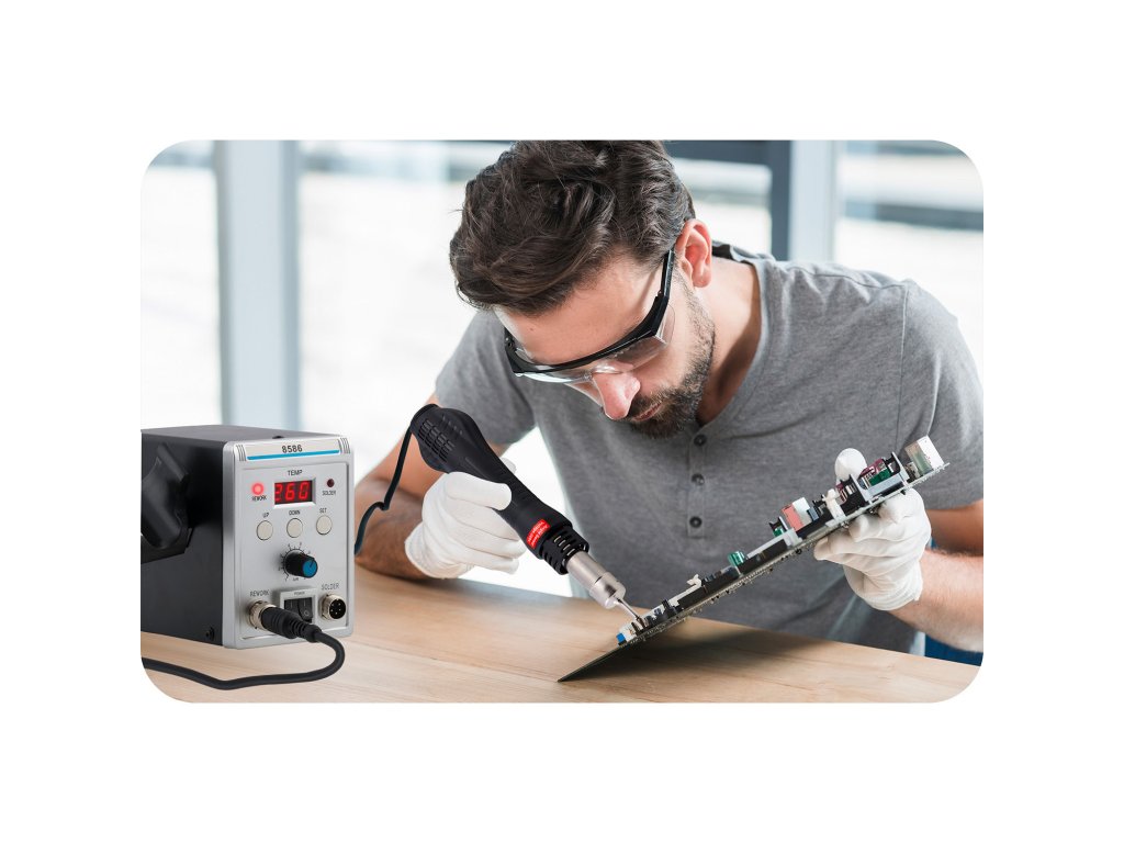 - Precíz forrasztás: A forrasztó szabályozott hőt biztosít az elemek nyomtatott áramköri lapra történő szerelése során.