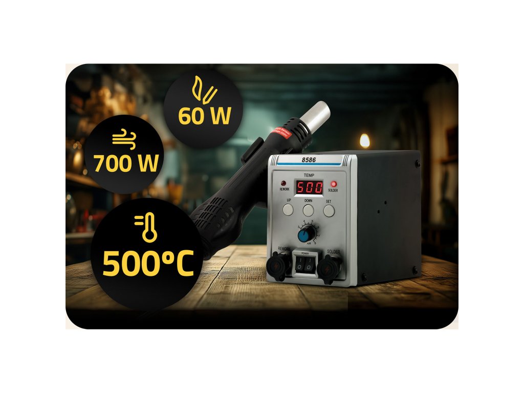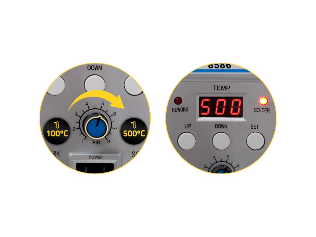 - Pontos hőmérséklet- és légáramlás-szabályozás: Hőmérséklet szabályozása 100 és 500°C között és a fúvás intenzitásának változtatása.