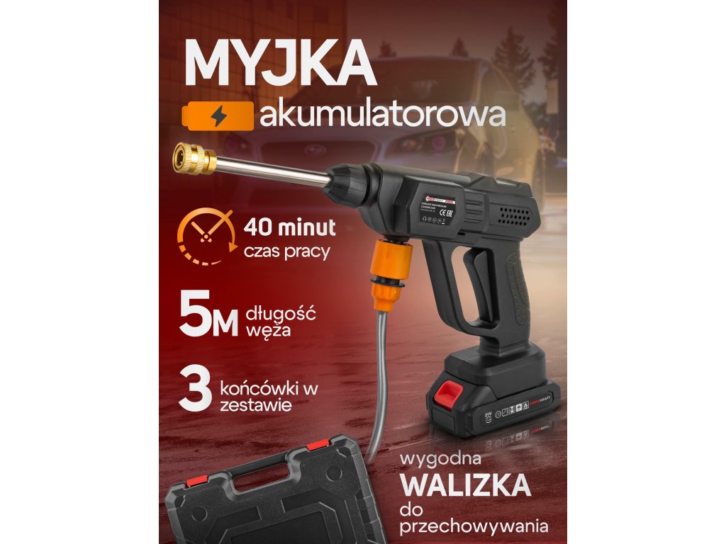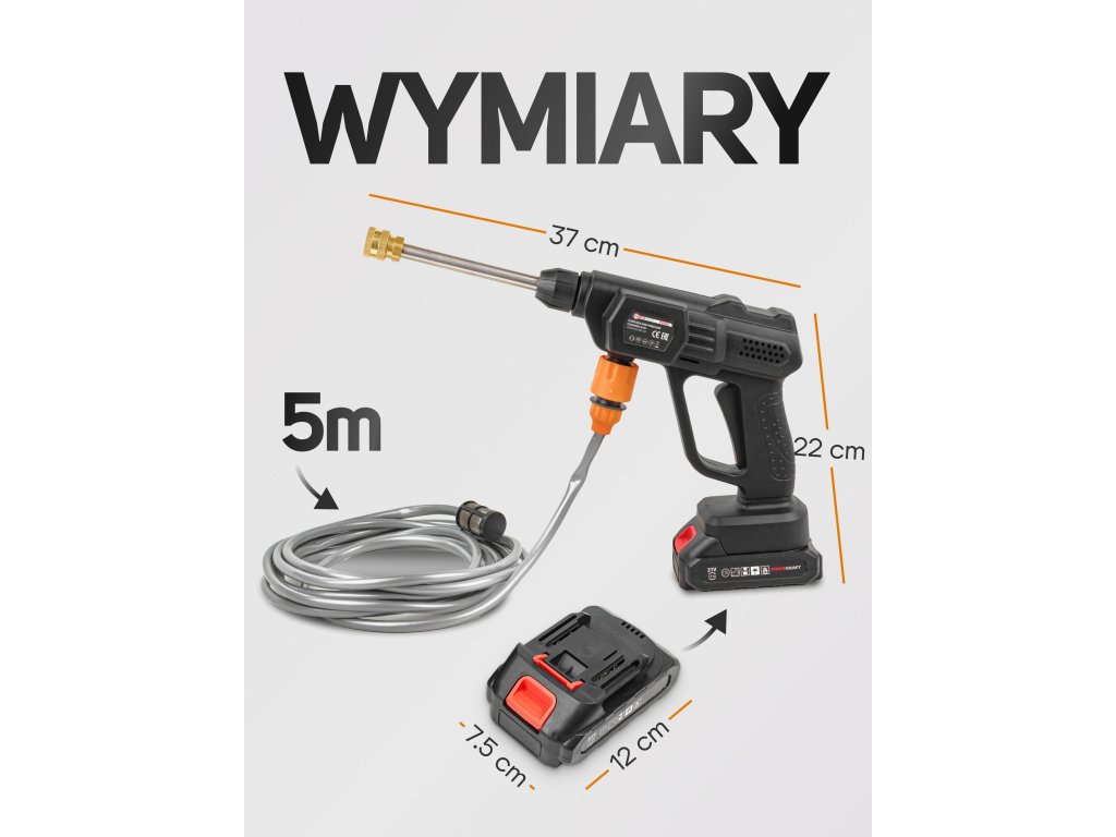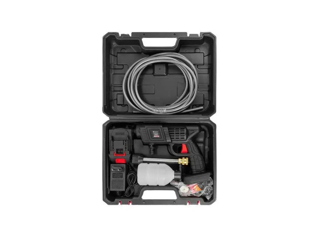 Akkumulátoros magasnyomású mosó 21V egy mobil és univerzális eszköz, amely kiválóan alkalmas otthon, a kertben, a garázsban és utazás közben. Az akkumulátoros táplálás miatt kábelek és korlátok nélkül működik, míg a kompakt kialakítás lehetővé teszi a könnyű hordozhatóságot és használatot bármilyen helyen.