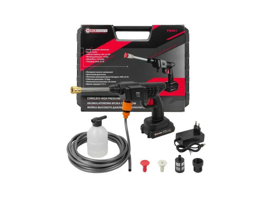 Szerezzen be egy multifunkcionális készletet – fúvókákkal, hab-generátorral és akkumulátorral, kész használatra azonnal a kibontás után.