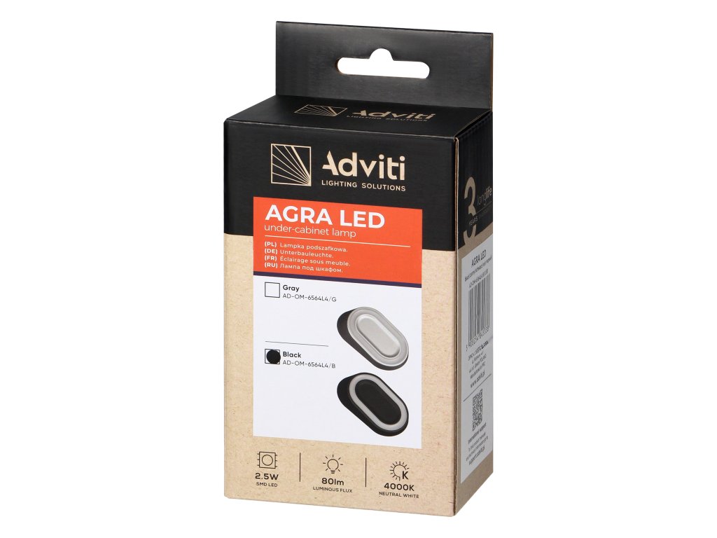 Az AGRA LED egy 2,5 W-os energiahatékony LED fényforrást használ, amely hosszú élettartammal és alacsony energiafogyasztással rendelkezik. A széles sugárzási szög garantálja az egyenletes fényeloszlást a teljes megvilágított felületen, optimális munkakörülményeket biztosítva vagy a gardróbtér megvilágításához. A lámpa száraz helyiségekben való használatra szolgál (IP20).