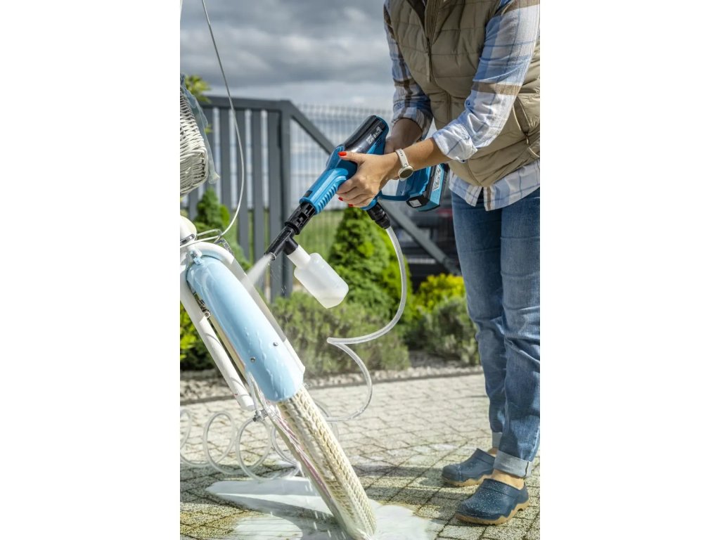 Az akkumulátoros magasnyomású mosó egy fantasztikus eszköz, amely lehetővé teszi az eszközök, autók, kerékpárok, teraszok vagy lépcsők gyors tisztítását bárhol - csak egy kis tiszta vízhez kell hozzáférni. Az eszközt könnyedén lehet közvetlenül a csapból vízzel működtetni egy hosszú szívócsővel, amely előszűrőszűrővel van ellátva, hogy megvédje a mosót a szennyeződésektől.