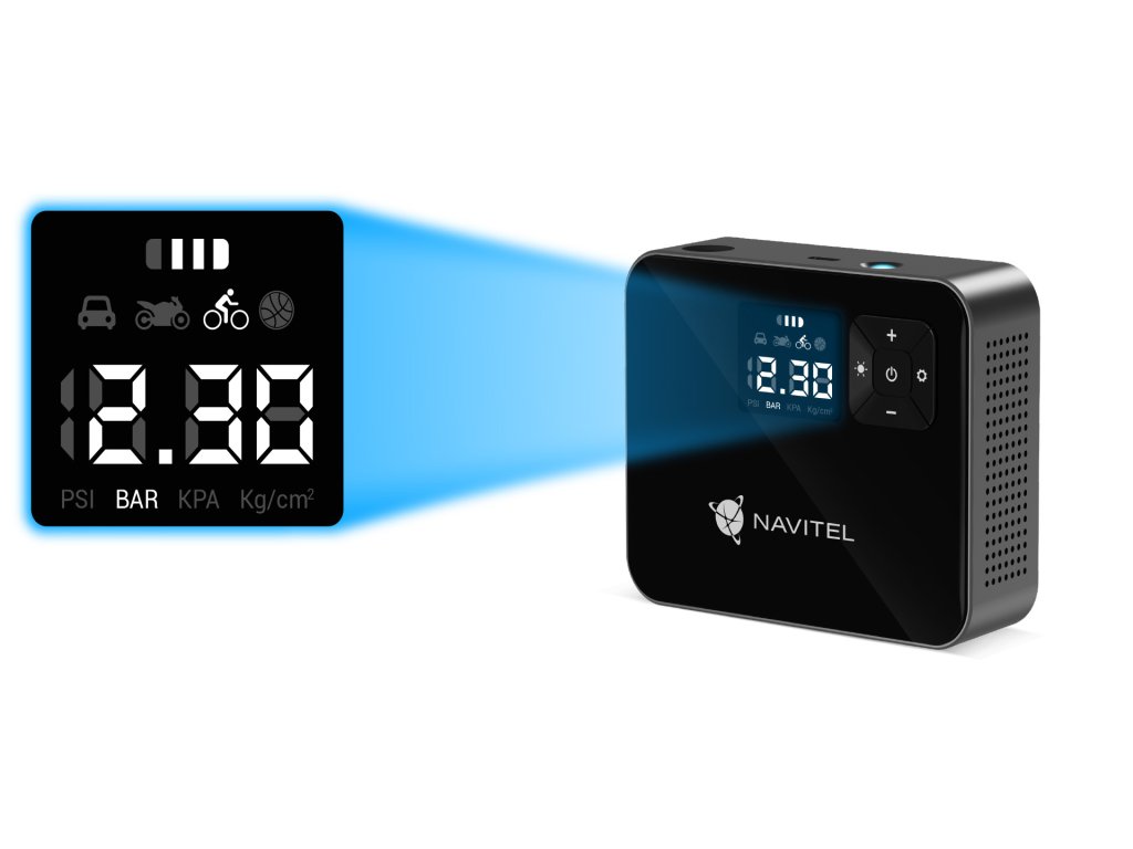 A fényes digitális kijelzőnek köszönhetően a szükséges mutatók teljes sötétségben is láthatók. Használja a NAVITEL AIR 15 AL-ot nemcsak a gumiabroncsok felfújására, hanem azok nyomásának ellenőrzésére is. Csatlakoztassa a készüléket és kapcsolja be a tápellátást, és a kezdeti érték a kijelzőn megmutatja az aktuális nyomást a gumiabroncsokban.