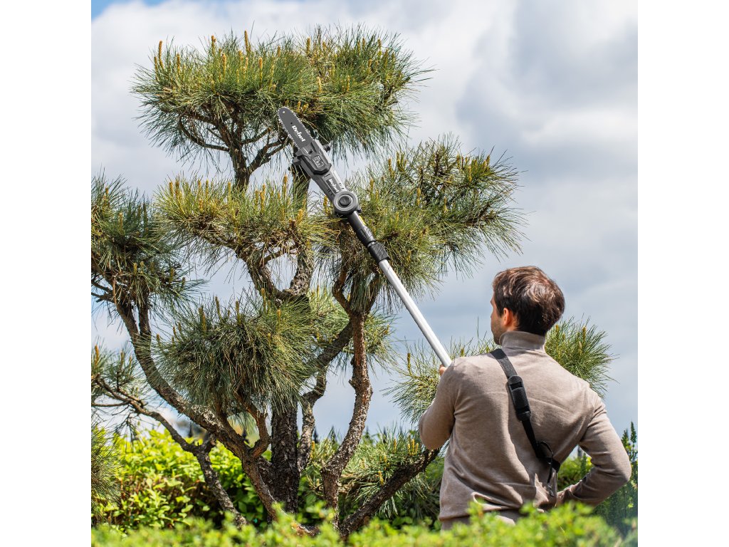 A készlet 20 cm-es vezetősínű láncfűrészt tartalmaz, amely akár 16 mm átmérőjű ágakkal is megbirkózik. A 3 szintű állítás és az automatikus lánckenés megbízható és zökkenőmentes vágást biztosít még intenzív munkavégzés során is.