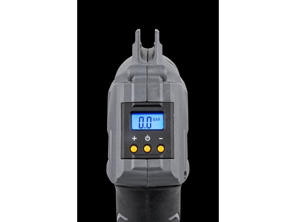 Háttérvilágítású LCD kijelző digitális kijelzéssel Aktuális nyomás kijelzése Nyomásbeállító funkció Automatikus kikapcsolás (a célnyomás elérésekor) Munkalámpa Akkumulátor töltöttségjelző Ergonomikus fogantyú Tartozéktároló rekesz ---------- TECHNIKAI ADATOK ---------- Akkumulátor: