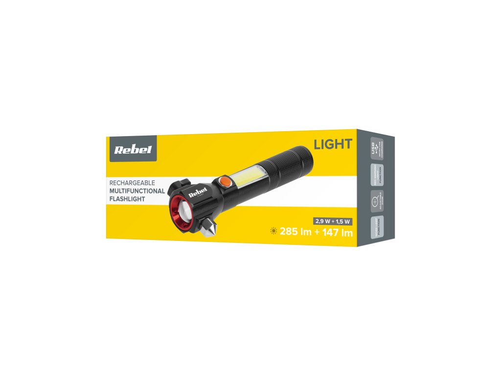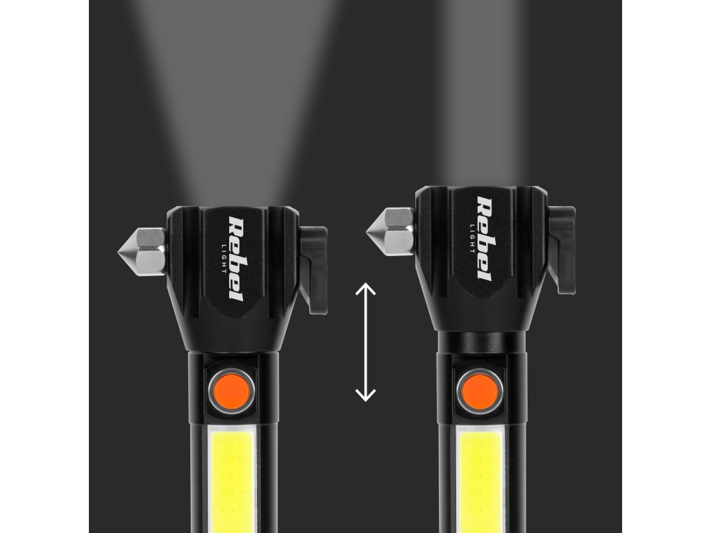 Két fényforrás biztosítja a Rebel zseblámpa kényelmes használatát. Az első 2,9 W-os LED 200 m hatótávolságú fénysugarat és 285 lm fényáramot generál. Az 1,5 W-os COB oldalsó lámpa viszont 147 lm fényáramot biztosít. A készülék munkalámpaként is használható, ami különösen hasznos a felújításoknál, illetve a garázsban vagy a szabadban végzett munkáknál.
