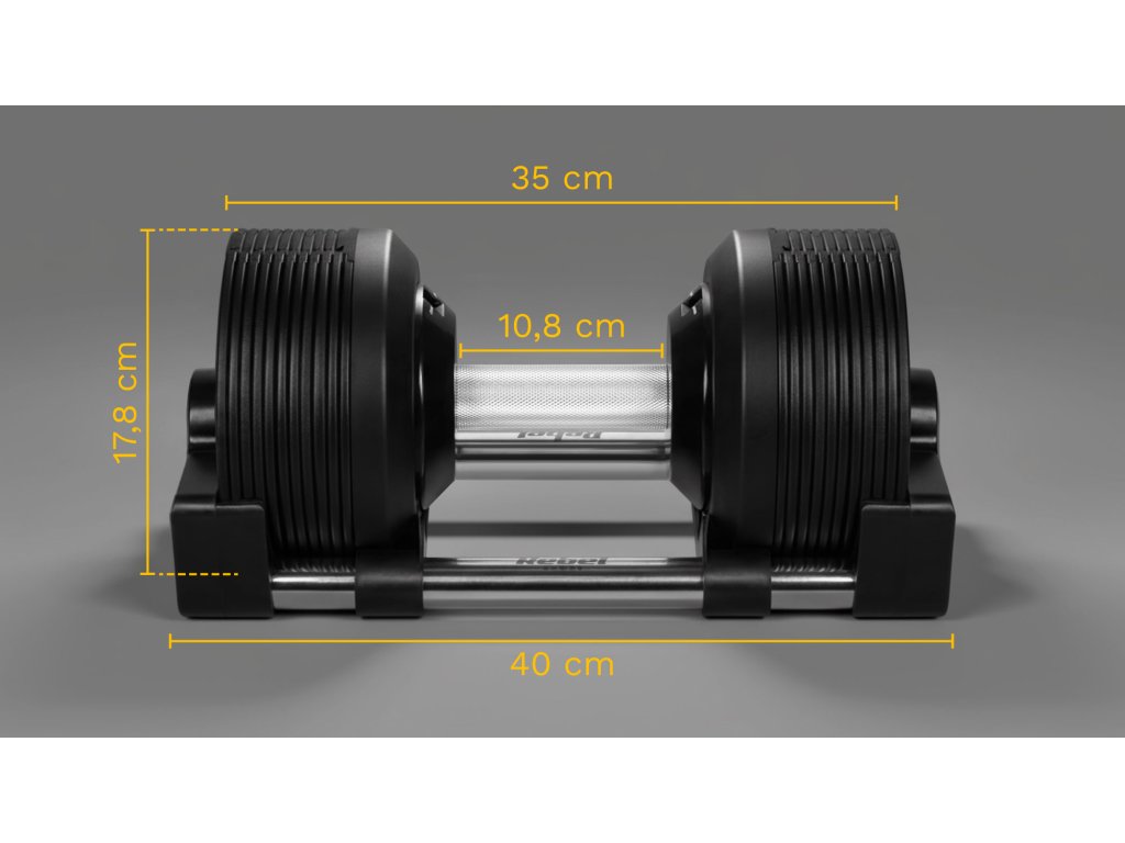 Hatékonyan edzhet otthona nyugalmában! A Rebel Active 24 kg-os állítható öntöttvas súlyzó egy sokoldalú eszköz, amely lecseréli a hagyományos súlyzók egész polcát. Az állítható súly 3 és 24 kg között van, 22 szintű terheléssel, így ez a súlyzó tökéletes otthoni edzésekre mind kezdők, mind haladók számára. Kompakt, masszív és biztonságos – úgy tervezték, hogy erősítse az összes izomcsoportot.