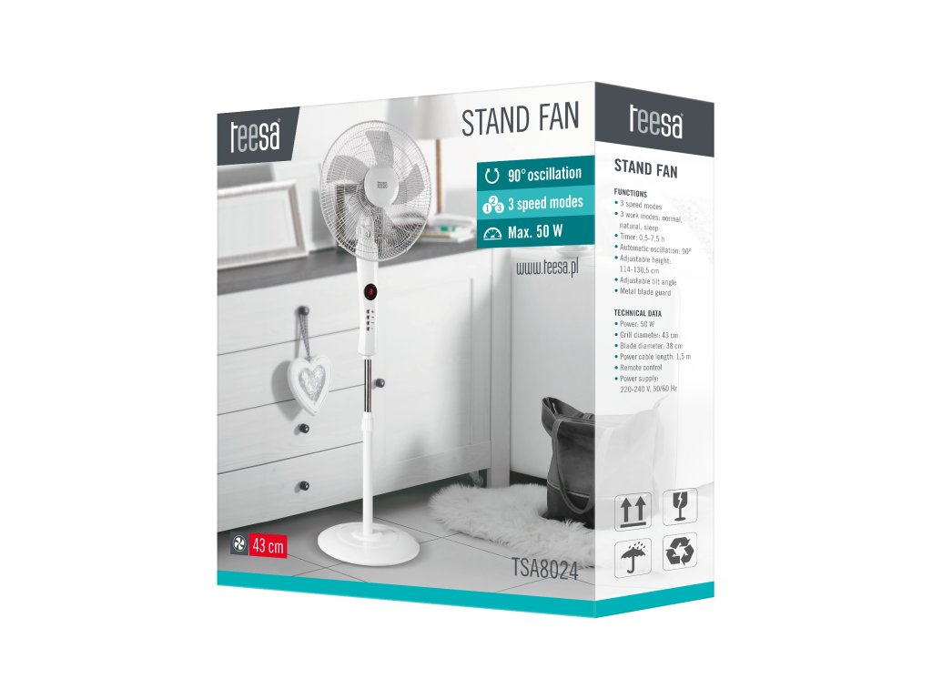 A Teesa elektromos ventilátor előnyei itt még nem érnek véget. Az 50 W-os motor által működtetett propellerek nagy átmérője az automatikus 90°-os oszcillációval kombinálva azt jelenti, hogy a ventilátor egy nagyobb helyiséget is gond nélkül képes lehűteni. A Teesa Home ventilátor időzítő funkcióval van ellátva, ami azt jelenti, hogy beállíthatja az automatikus kikapcsolás idejét. A készülék egyik előnye mindenképpen az állítható magasság és a dőlésszög változtatásának lehetősége. Ez a szobai ventilátor a biztonságról is gondoskodik a készülék propellereit körülvevő fémháznak köszönhetően.