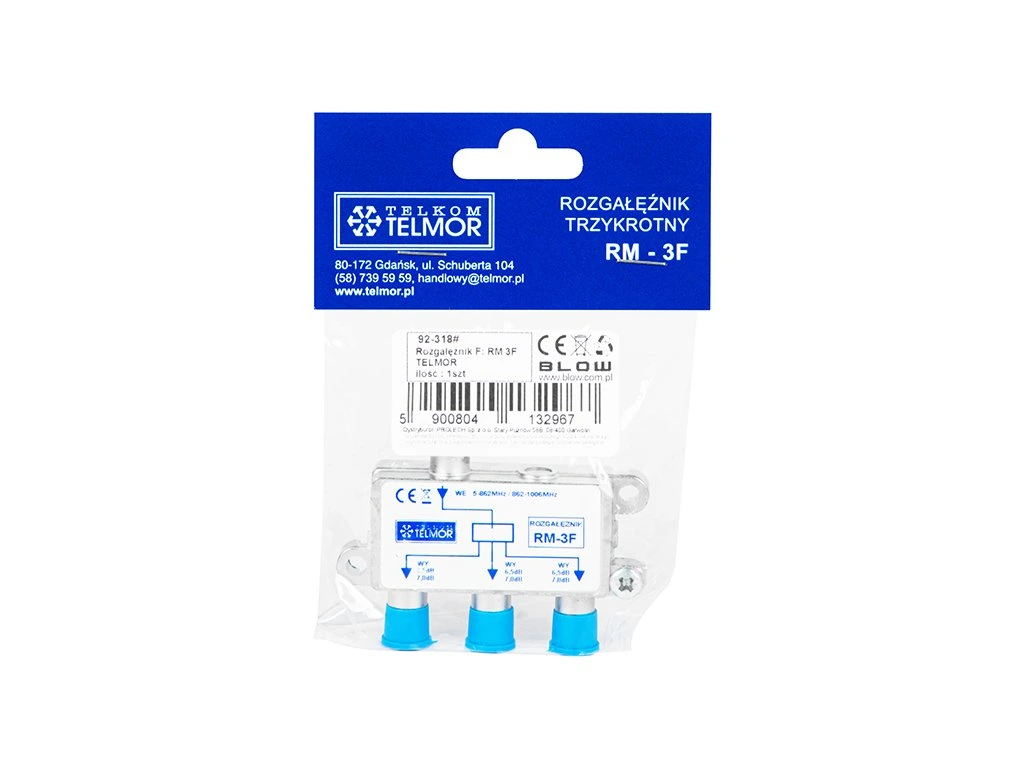 Rozgałęźnik małostratny marki Telmor przeznaczony do rozgałęziania lub sumowania sygnałów radiowych i telewizyjnych we wszelkiego rodzaju instalacjach antenowych. Umożliwia przejście sygnałów z jednego przewodu koncentrycznego na trzy, przy zachowaniu równomiernego podziału mocy sygnału wejściowego.