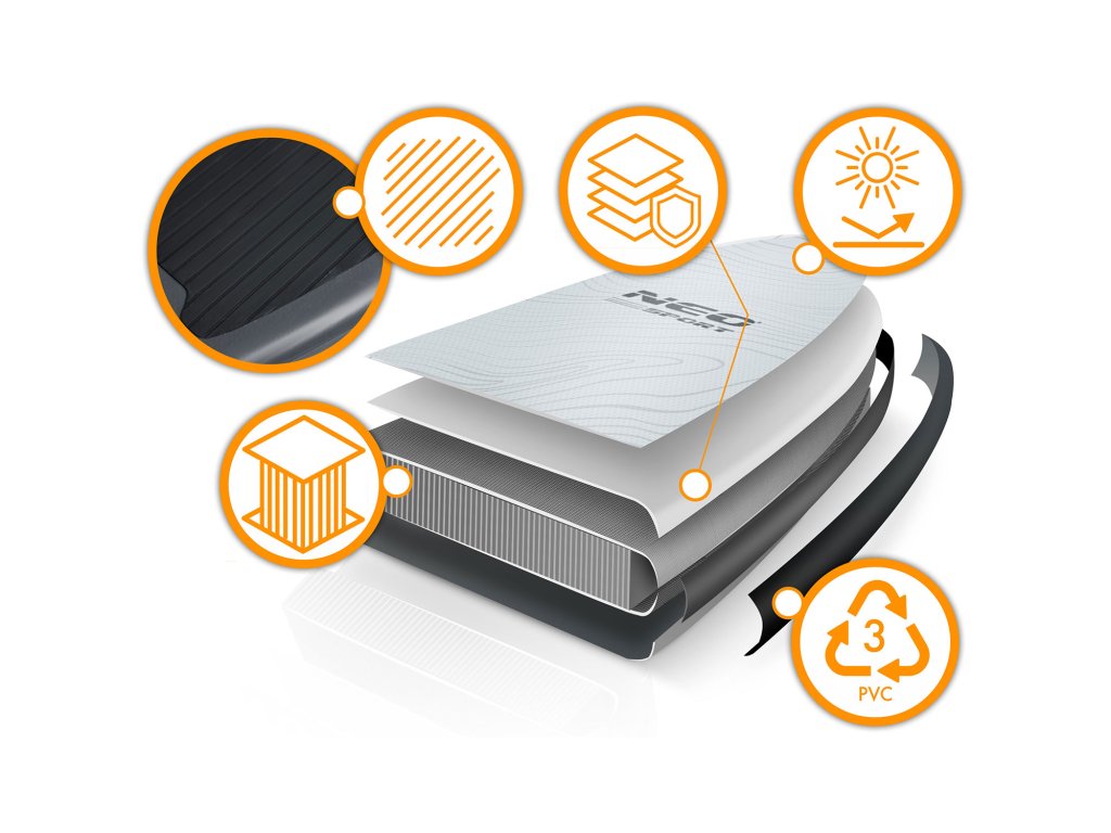 Prémium osztályú SUP deszka háromrétegű PVC szerkezettel, beépített karbon sínekkel és megerősített varratokkal.
