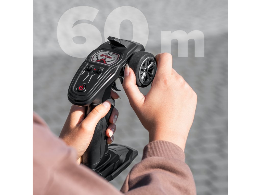 ARevolt távirányítós autó előnyei itt még nem érnek véget. Akészlethez mellékelt távirányító hatótávolsága akár 60 métert is elér, így az autó gyorsan eltűnik a szemünk elől, mielőtt elveszítenénk felette az irányítást.