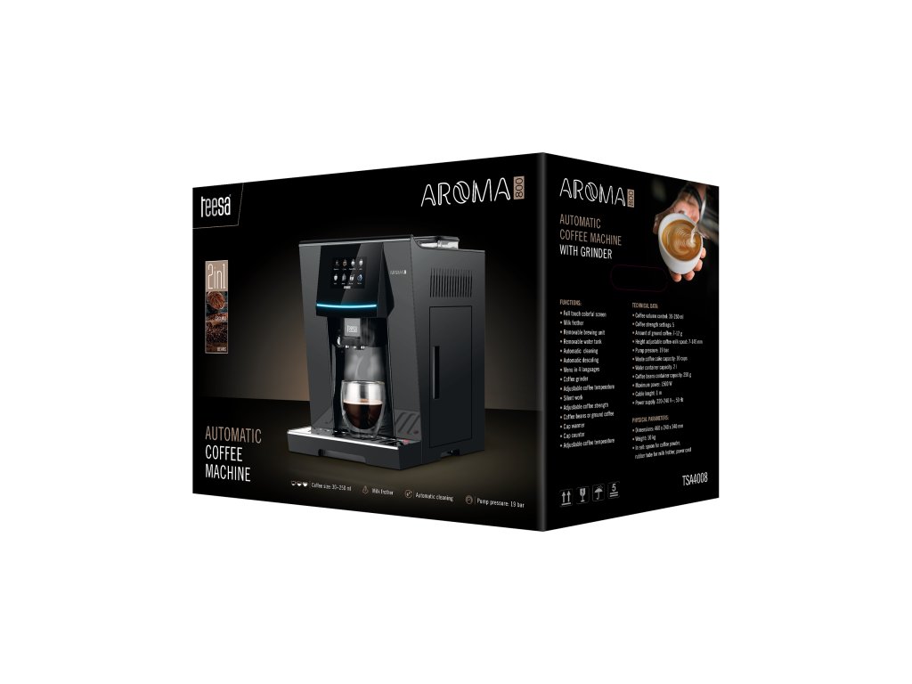 A Teesa AROMA 800 kávéfőző olyan alkatrészekkel van felszerelve, amelyek könnyen tisztíthatók folyó víz alatt. Emellett automatikus tisztító és vízkőmentesítési funkciók is vannak, amelyek megkönnyítik a gép tisztán tartását. Vigyázzon a kávéfőzőre, és élvezze a kávé kivételes ízét minden nap! .