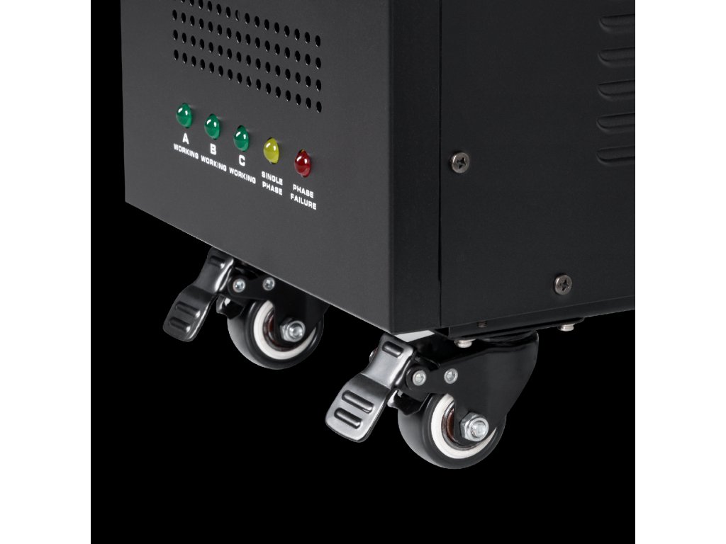 Háromfázisú üzemmódban fontos az egyensúly fenntartása a fázisok között. A stabilizátor figyeli és szabályozza az egyes fázisok feszültségét, hogy biztosítsa a közötti összhangot - kompenzálja a túl magas vagy túl alacsony bemeneti feszültséget, és stabilizálás után kimeneti feszültséget ad. Ha ebben az üzemmódban az egyik fázis nem működik megfelelően, vagy nincs csatlakoztatva, az eszköz aktiválja a védelmet, és nem ad feszültséget a kimenetre, erről a "PHASE ERROR" jelző tájékoztat.