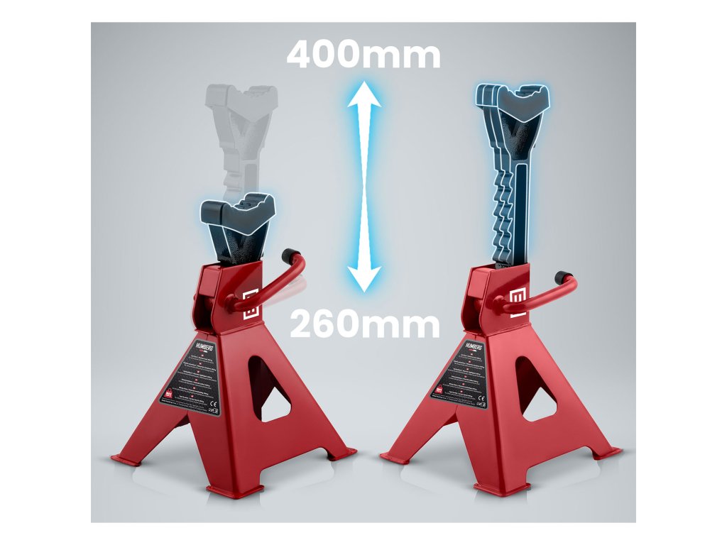 A tátongók kényelmes reteszelő mechanizmussal rendelkeznek, amely lehetővé teszi a magasság gyors és biztonságos állítását 260 mm-től 400 mm-ig. Így könnyedén beállíthatod a járművet a megfelelő szintre – ügyetlenkedés és időpazarlás nélkül.