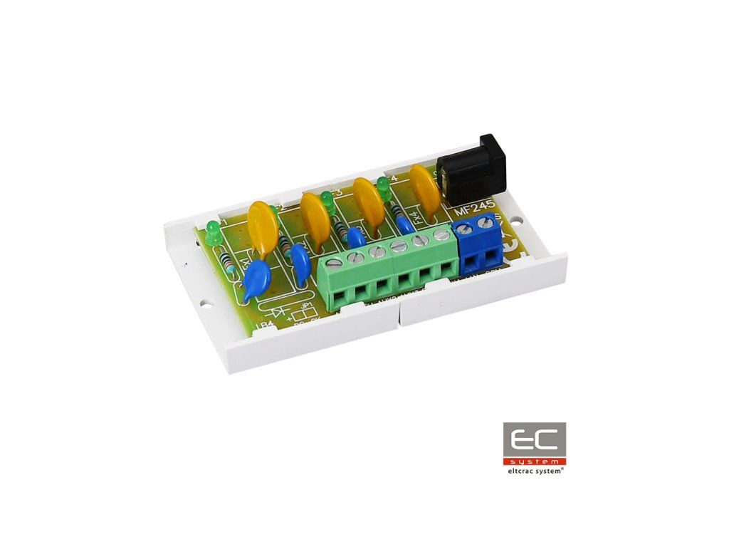 Biztosítékmodul, amely a tápellátás elosztására szolgál alacsony feszültségű riasztórendszerekben, amelyek 10V és 30V DC közötti feszültséget igényelnek. Két tápellátási bemenete van: csavaros csatlakozó és egy DC 5,5/2,1 aljzat, valamint négy függetlenül védett PTC 1A AUX1÷AUX4 tápellátási kimenet. A PTC biztosíték aktiválása a modul megfelelő LED lámpájának kialvásával jelezhető: L1 az AUX1-hez, L2 az AUX2-höz stb. Ezen kívül minden kimenet varisztorral védett, amely megvédi a tápellátást és a vevőket a tápáramkörben fellépő túl feszültség okozta következményekkel szemben.
