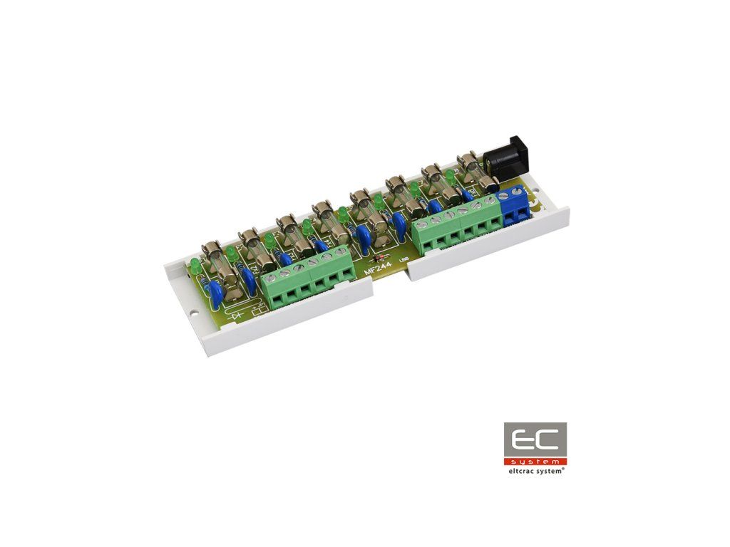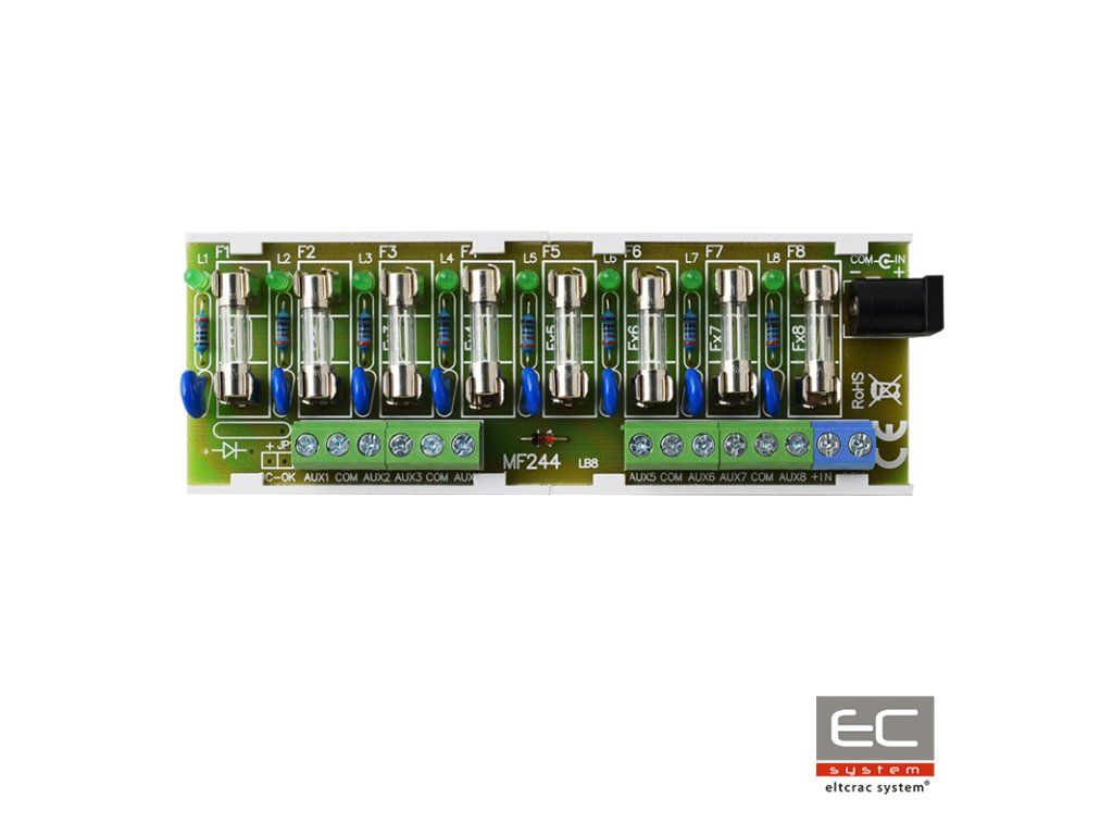 Biztosíték modul az alacsony feszültségű riasztó rendszerek tápellátásának elosztására melyeknek a feszültség igénye: 10V÷ 30V DC. Két tápbeviteli bemenettel rendelkezik: csavaros terminál és DC 5,5/2,1 aljzat, valamint nyolc függetlenül biztosítékokkal védett F0,5A táp kimenettel AUX1÷AUX8. A biztosíték állapota a modul megfelelő LED diódájának kialvásával jelezhető: L1 AUX1-hez, L2 AUX2-höz stb. Ezen felül minden kimenet varisztorral van védve, amely védi a tápegységet és a vevőegységeket a tápellátásban fellépő túlfeszültségek hatásaitól.