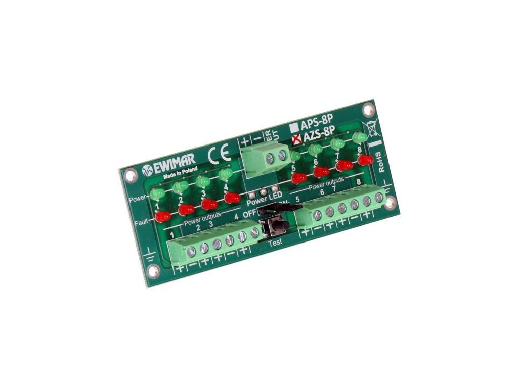 AZS-8P túlfeszültség védelem, amelynek feladata, hogy biztosítsa az alarm szenzorok tápellátásának hatékony és karbantartást nem igénylő elválasztását az S osztályú rendszerekben. Az eszköz szupergyors biztosítékokat MOSFET használ, így a tápellátás egyik szenzorában fellépő rövidzárlat csak egy áramkört bont le 1uS alatt, anélkül, hogy terhelné a riasztóközpont tápforrását, és korlátlan ideig tarthat. A tápellátás azonnal helyreáll, amint a rövidzárlat megszűnik az áramkörben, bármilyen karbantartás nélkül. A maximális áramkapacitás 100mA. A készülékbe épített dióda, amely jelez a hiba állapotáról, és lehetővé teszi, hogy olvassa minden csatorna tápellátásának állapotát. Rövidzárlat esetén vörös LED-ek világítanak. Ezzel szemben a zöldek a feszültség jelenlétét jelzik az egyes csatornákon. Alapértelmezés szerint ezek a LED-ek le vannak kapcsolva, hogy ne terheljék a tápforrást / akkumulátort. A tesztgombbal átmenetileg bekapcsolhatók. A LED-ek állandóan is bekapcsolhatók jumper segítségével.