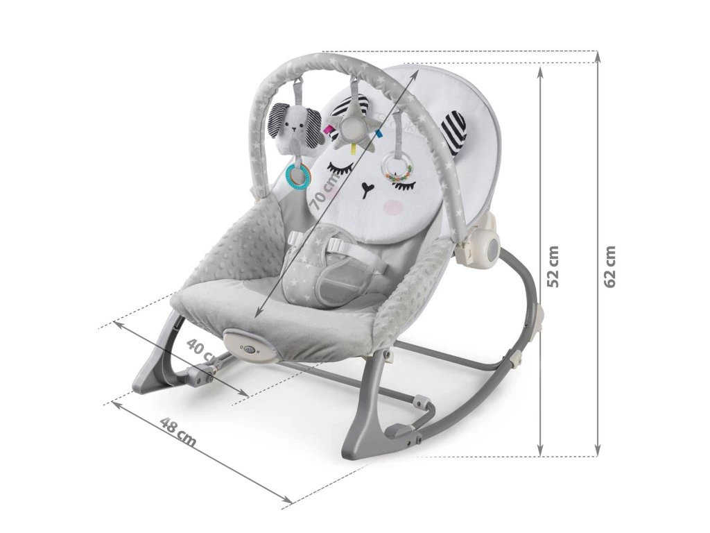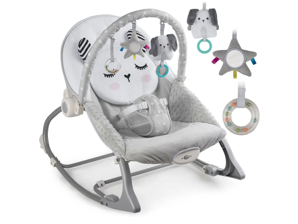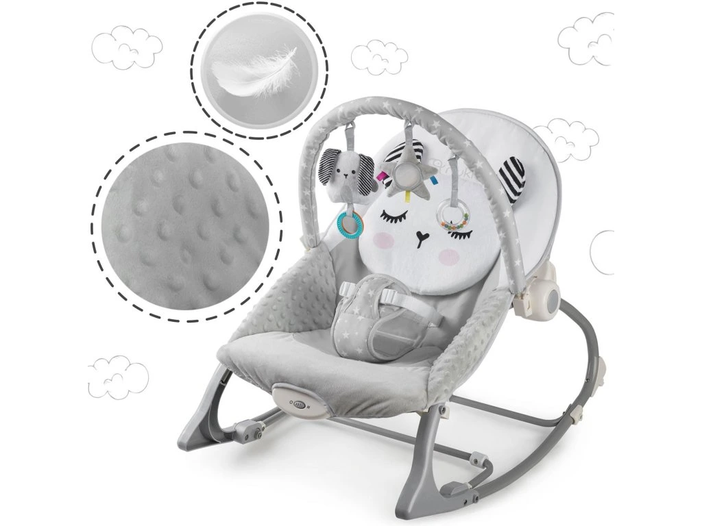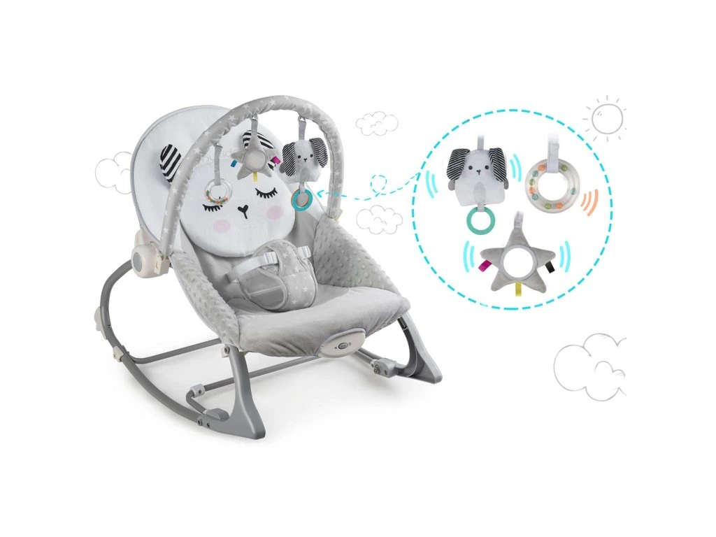 Ababahintető levehető fejpánttal rendelkezik, amelyhez zörgő játékokat csatoltak, hogy szórakoztassa a babát, amíg Ön pihen .Ezek az egyedi játékok serkentik a látást és fejlesztik a tapintási készségeket.