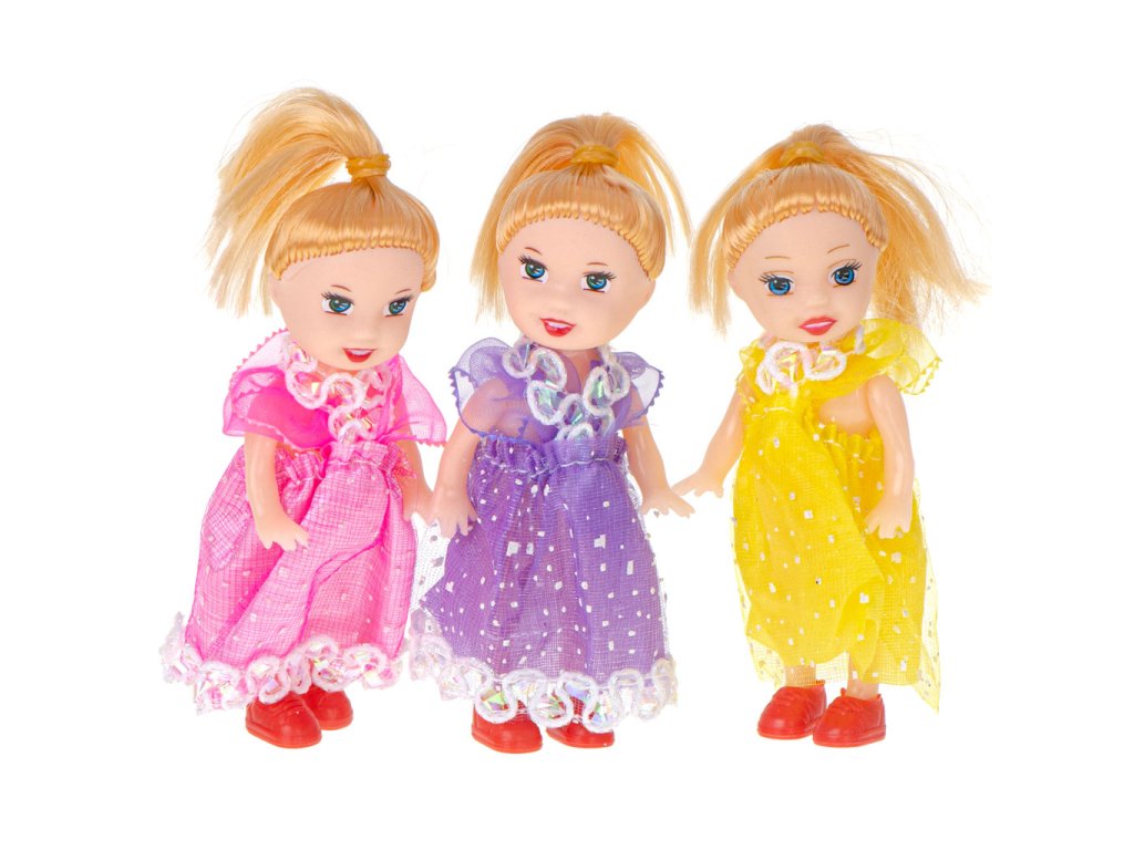Mindegyik babának más színű ruhája van: rózsaszín, sárga és lila, valamint piros cipője.
