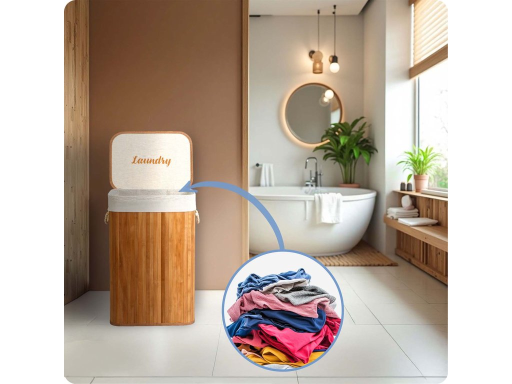 - Bambusz kosár: magas minőségű, természetes bambusz kivételes szilárdságot, nedvességgel szembeni ellenállást és antibakteriális tulajdonságokat biztosít, miközben tökéletesen illik stílusos, környezetbarát belső terekbe.