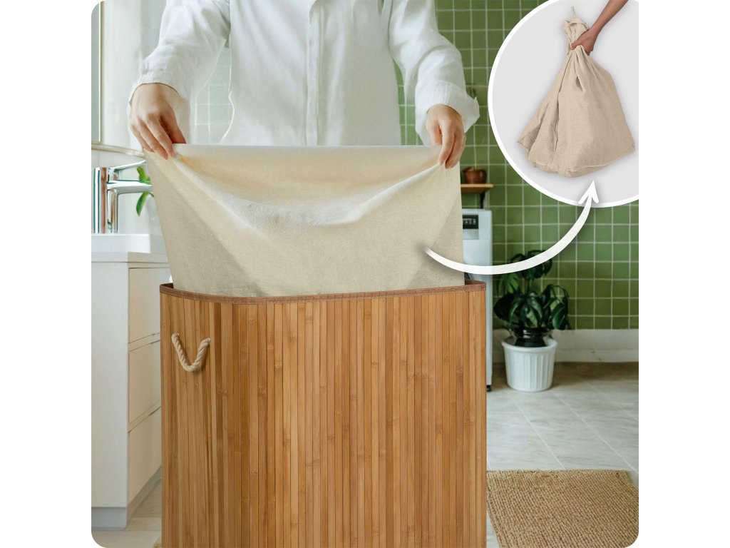 A természetes pamutból készült betét praktikus mosózsákká alakítja a kosarat. Ha megtelt, egyszerűen húzd ki, kösd meg, és vidd a mosógépbe — időt takarítasz meg, elkerülöd a rendetlenséget és fenntartod a tisztaságot.