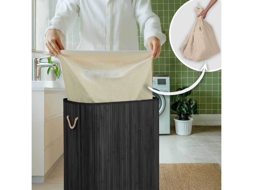 A természetes pamut bélés átalakítja a kosarat egy praktikus mosózsákká. Kitöltés után csak ki kell venni, megkötni és áthelyezni a mosógépbe – időt takarít meg, elkerüli a rendetlenséget és fenntartja a tisztaságot.