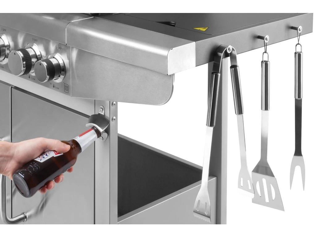 És ezzel még nincs vége a Teesa grill által nyújtott kényelmi szolgáltatásoknak. A készülék praktikus kampókkal is rendelkezik, amelyekre felakaszthatja a szükséges tartozékokat. Ezenkívül a grill palacknyitóval is fel van szerelve! Szintén említést érdemel a szekrény, amelynek köszönhetően rendet tarthat a munkafelület körül.