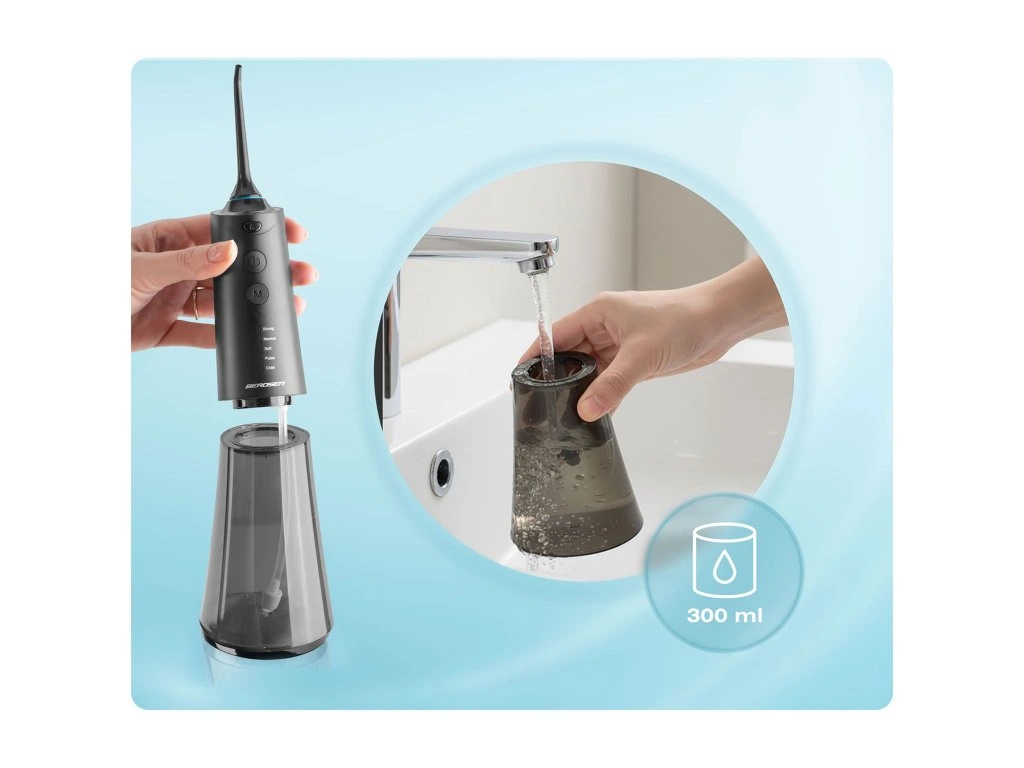 Hosszabb működés megszakítás nélkül:- nagyobb tartály lehetővé teszi a hosszabb öblítést kiegészítés nélküli szünetek nélkül, különösen előnyös az ortodontikus készüléket vagy hidakat viselő emberek számára.Nagyobb kényelem és hatékonyság: a ritkább tartálytöltés