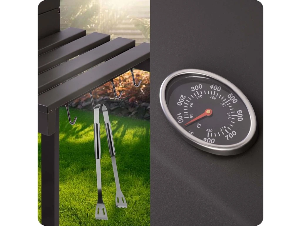Beépített hőmérő: lehetővé teszi a grill belső hőmérsékletének pontos nyomon követését, ami kulcsfontosságú a különböző ételek pontos elkészítéséhez.