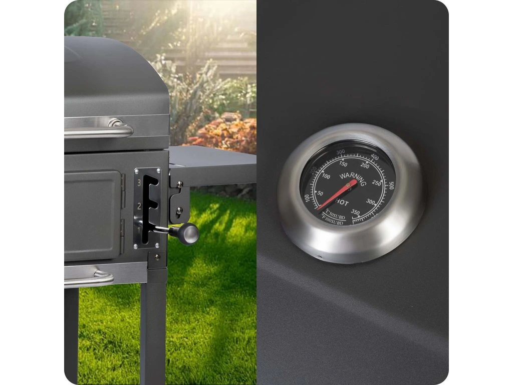 biztosítja a hő egyenletes eloszlását, amely az ételek egyenletes grillezését eredményezi. Az öntöttvas jól tartja a hőt, ami lehetővé teszi a hús jobb barnulását.Beépített hőmérő: lehetővé teszi a grill belső hőmérsékletének pontos nyomon követését, ami kulcsfontosságú a különféle ételek pontos elkészítéséhez.
