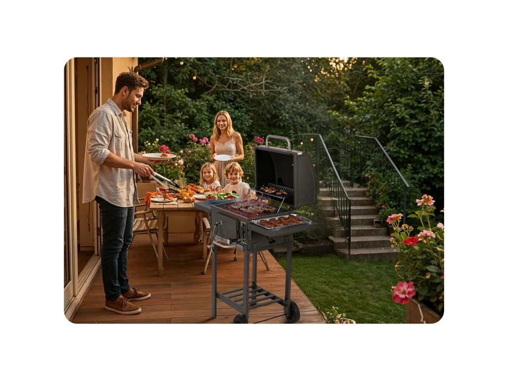 Emlékezetes találkozások — varázsolja kertjét társasági összejövetelek központjává! Grillünk magához vonzza a közös pillanatokat finom ételek mellett.
