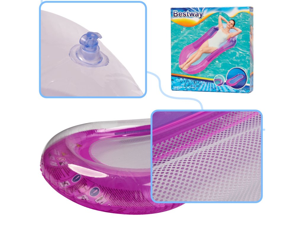 A Bestway hihetetlenül kényelmes hálós alsó matracában a jó ízlés és a vágyott pihenés ötvöződik. A matrac félig átlátszó PVC anyagból készült, amely tartós és ellenáll a kisebb sérüléseknek és elszíneződéseknek. Emellett a felfújható háttámla és a karfák gondoskodnak a kényelméről, miközben pihen. A matrac ideális a forró napokon, amikor a hagyományos matracon való fekvés kényelmetlen, a hálós aljának köszönhetően egyszerre pihenhet és hűsölhet.